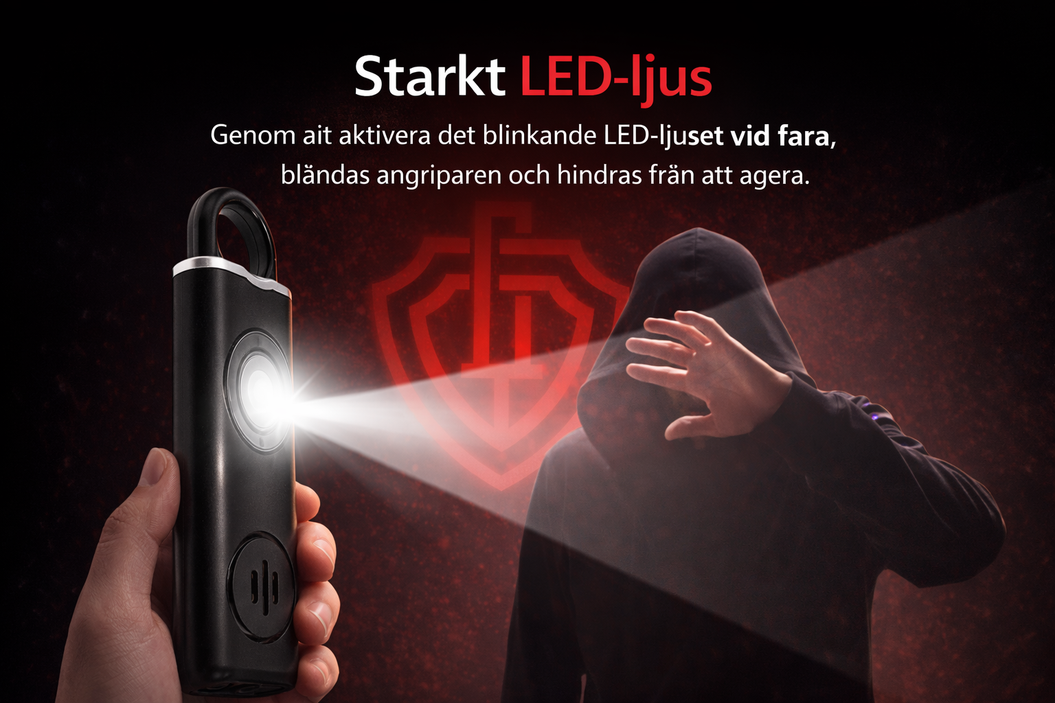 Vid aktivering blinkar den inbyggda LED-lampan, vilket ökar synlighet och förstärker larmets effekt, särskilt i mörka miljöer. Utöver larmfunktionen kan LED-lampan användas separat som ficklampa, vilket gör ShieldRing™ till ett praktiskt hjälpmedel även i vardagliga situationer.